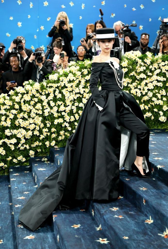 JENNIE a fait ses débuts au Met Gala en 2023 avec une robe vintage de Chanel, coute, noire et blanche avec au centre du buste une camélia, provenant de la collection prêt-à-porter automne 1990. Avec des escarpins noirs en satin assortis à ses gants et collants. Comme bijoux : des boucles d’oreilles en diamants et un choker noir.