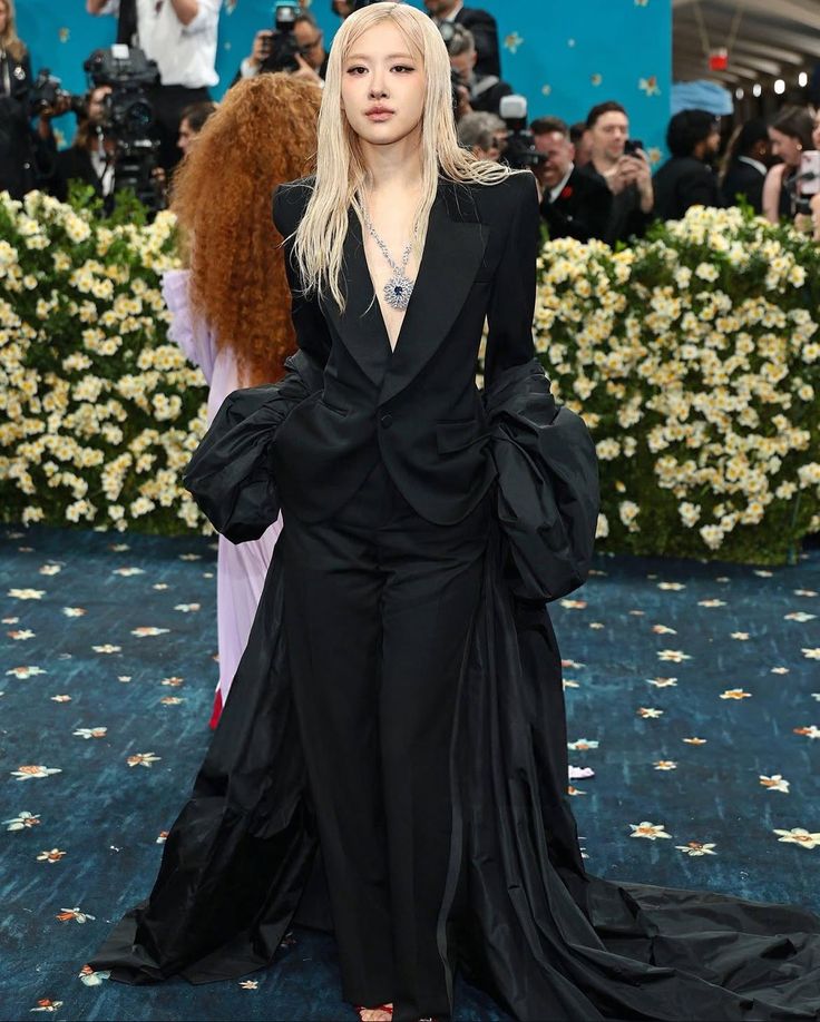 En 2025, ROSE fait un retour après 4 ans. Cette fois-ci aux côtés de ses 2 autres BEST FRIENDS. Elle portait un costume Saint Lauren, noir structuré avec des épaules marquées et un long drapé en cape, conçu par ANthony Vaccarello. Elle a complété sa tenue avec des talons rouges et des bijoux en saphir et diamants de Tiffany&Co.
